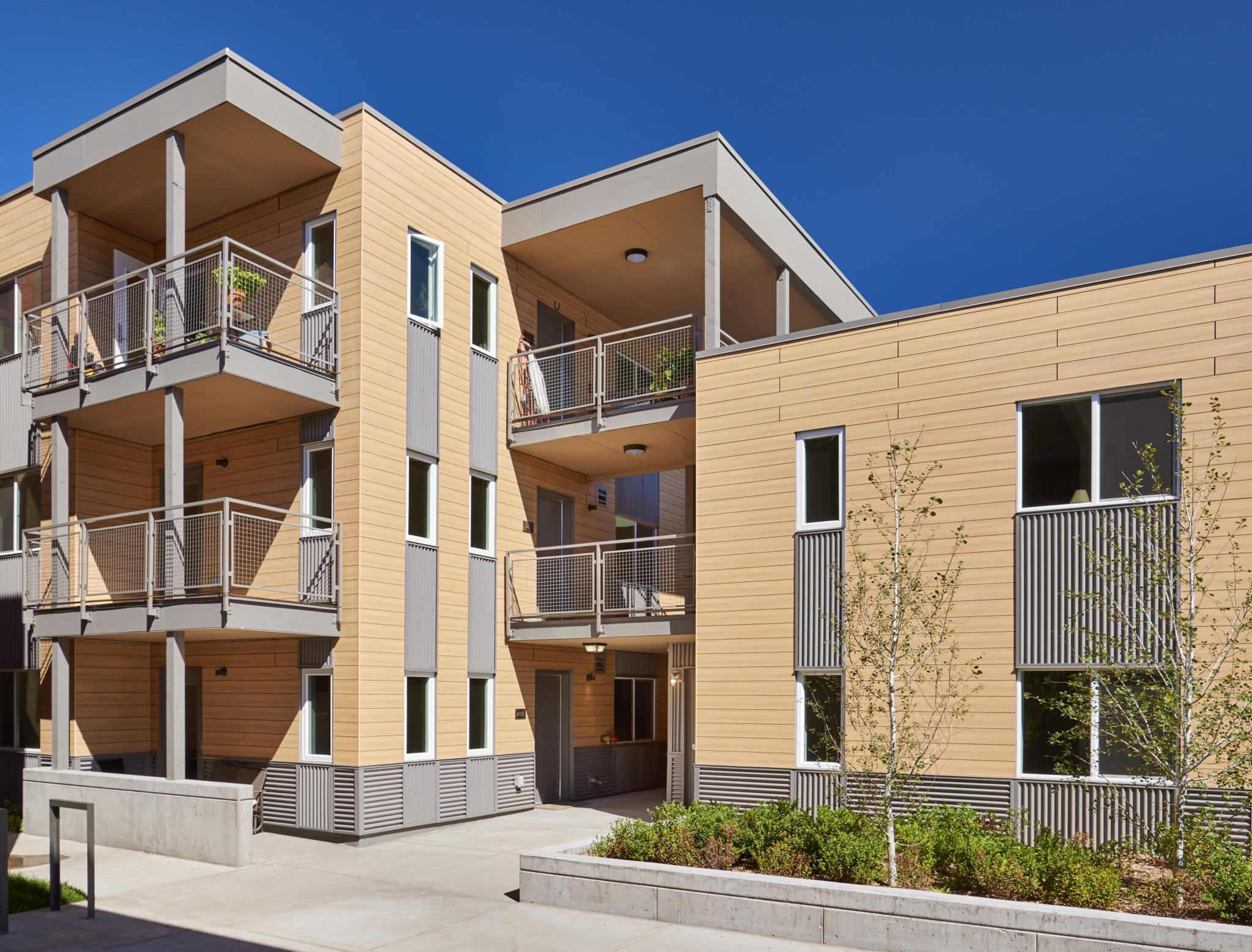 Pura® NFC by Trespa in Aged Ash was selected to clad the building and create a warm, welcoming exterior; panels on the building's street- and courtyard-facing façades were installed vertically to help break up the surface and reinforce the project’s modern vibe.